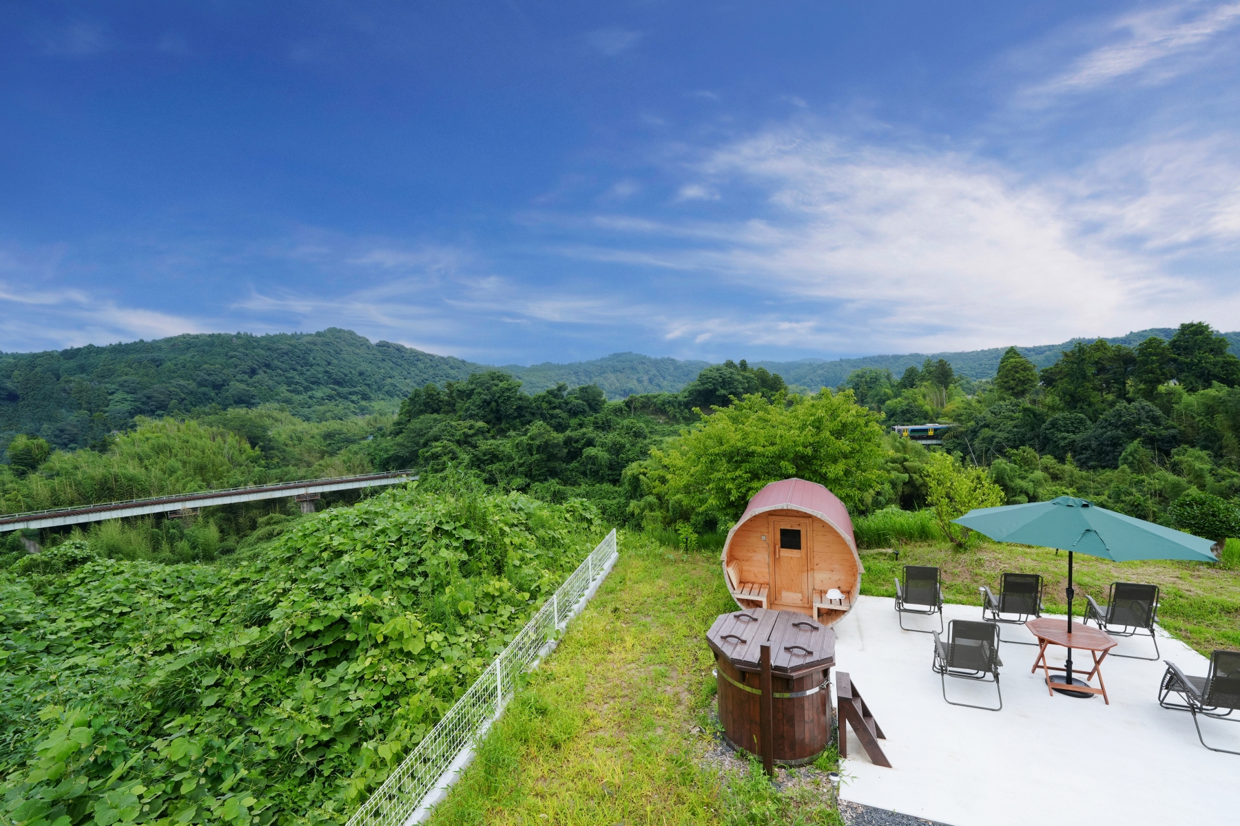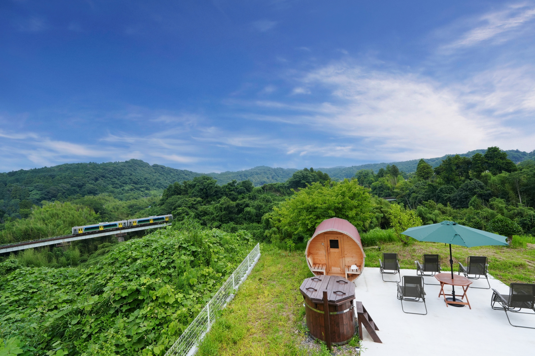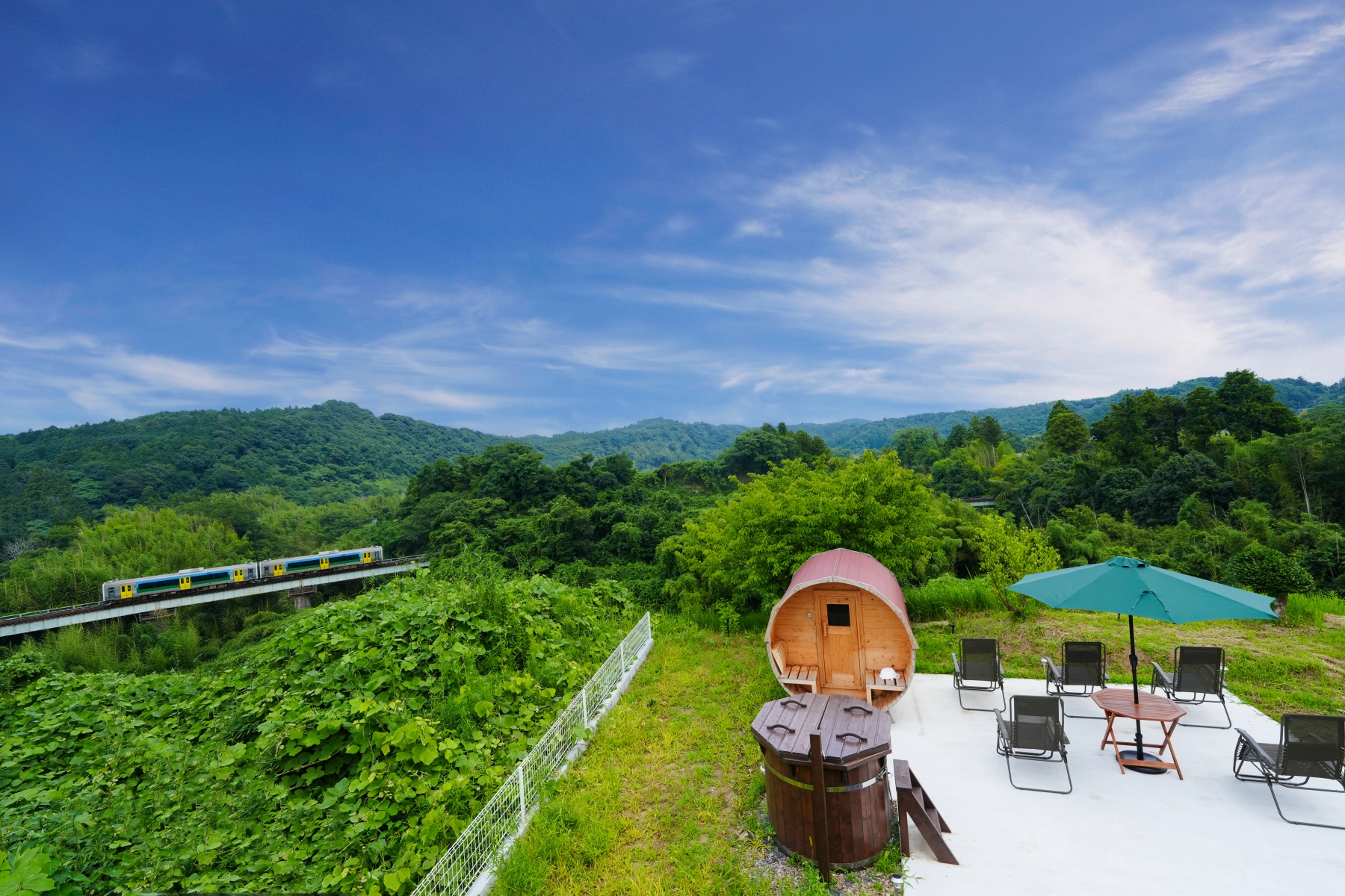・自然に囲まれた中で外気浴とサウナを楽しみながら過ごすシーン。
