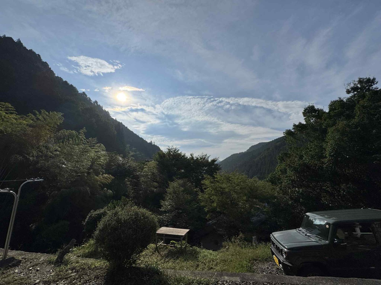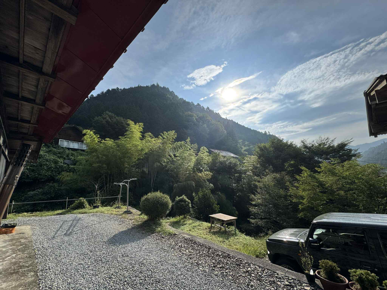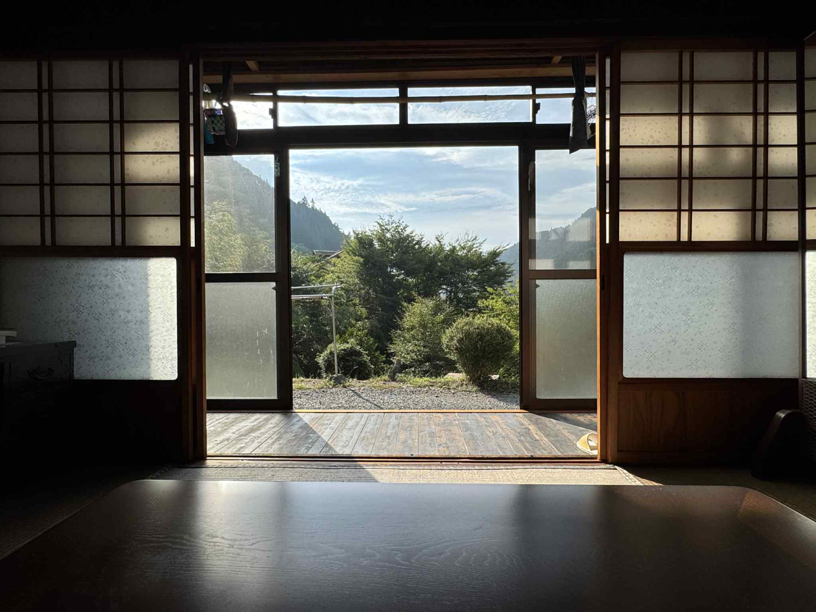 ・縁側に座って雄大な山々を見ながら、語り合うシーン