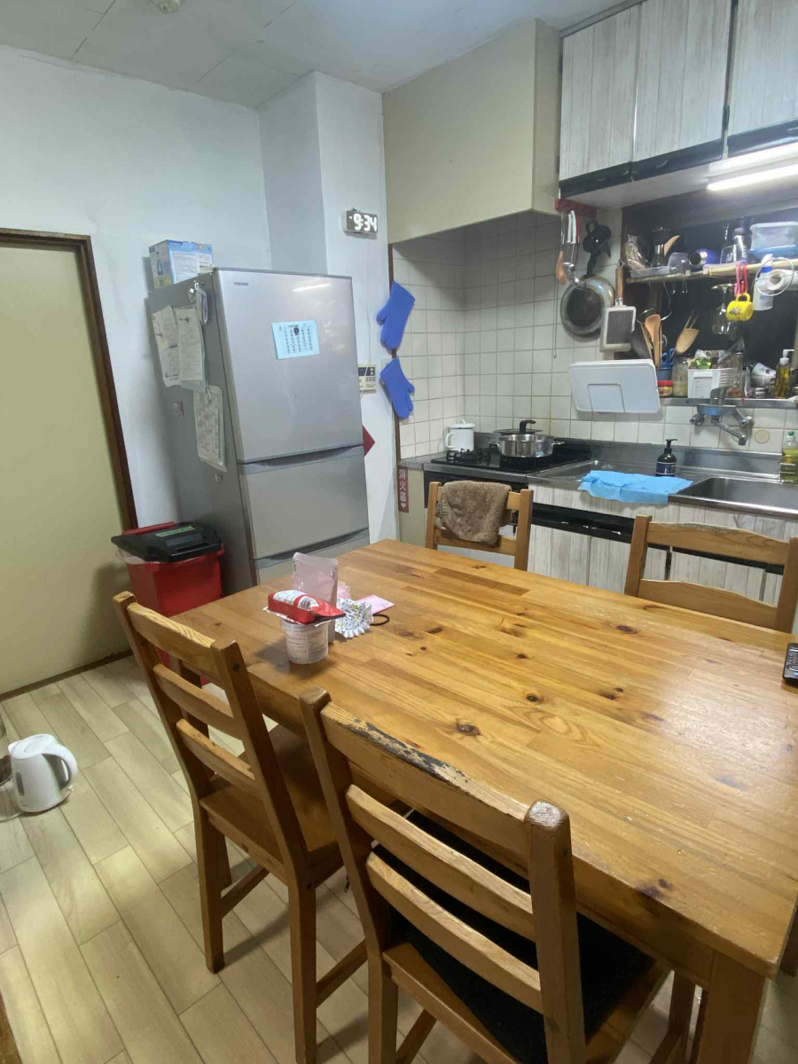木の食卓テーブルと椅子、壁面の吊戸棚、調理器具などが備わり、