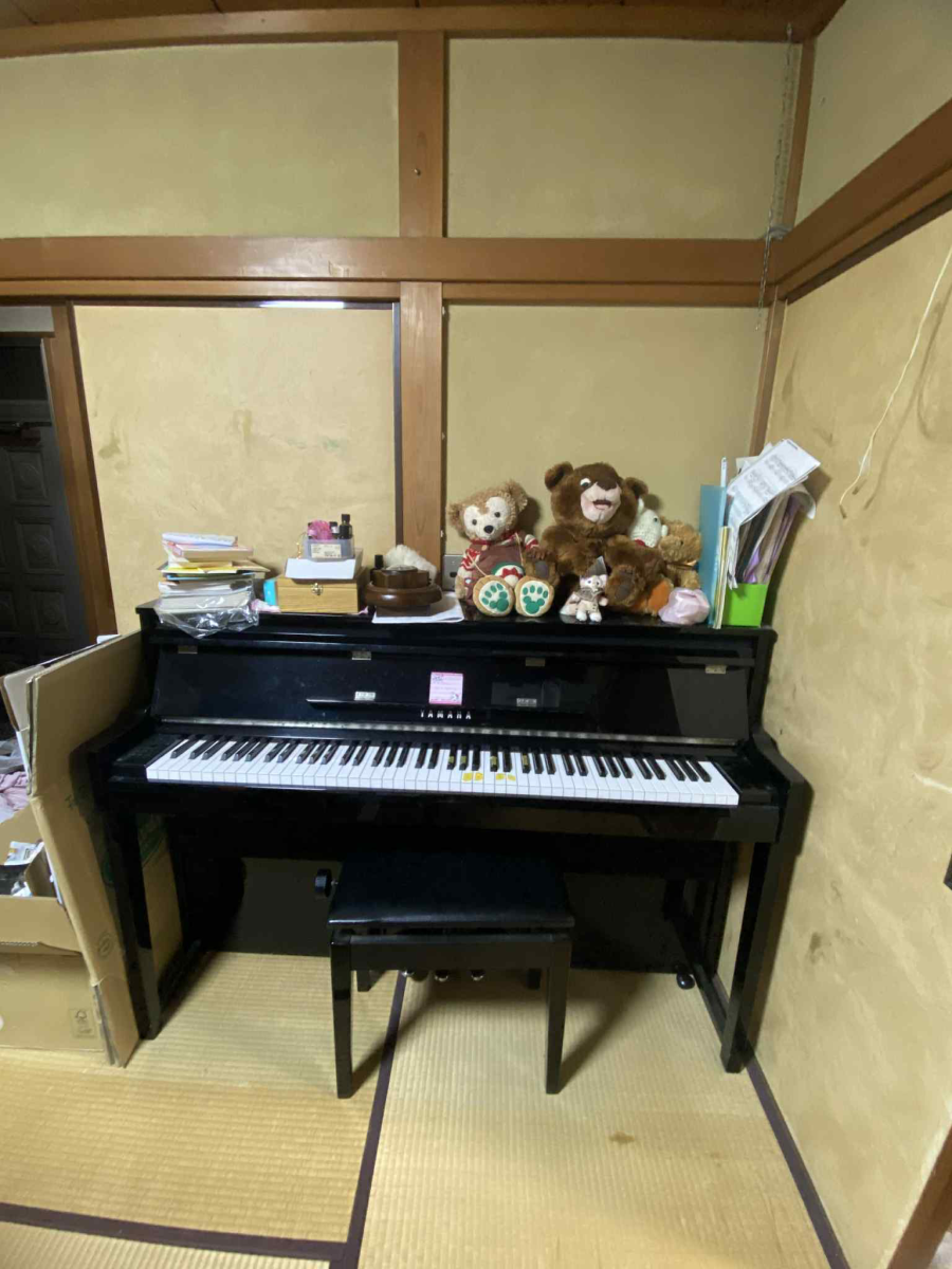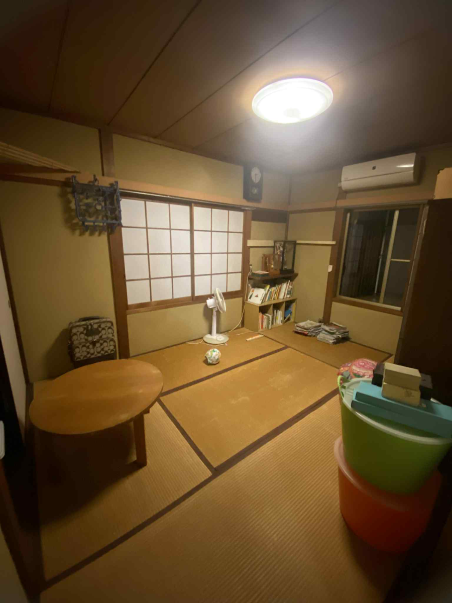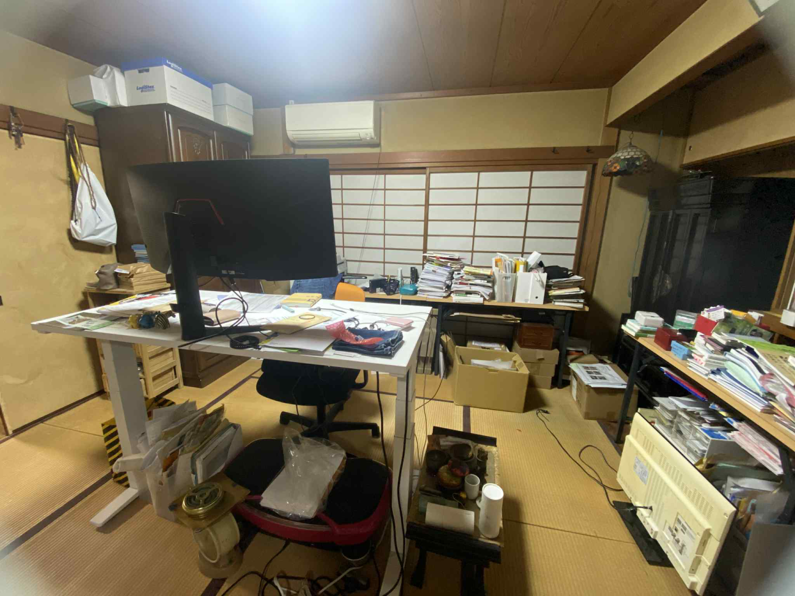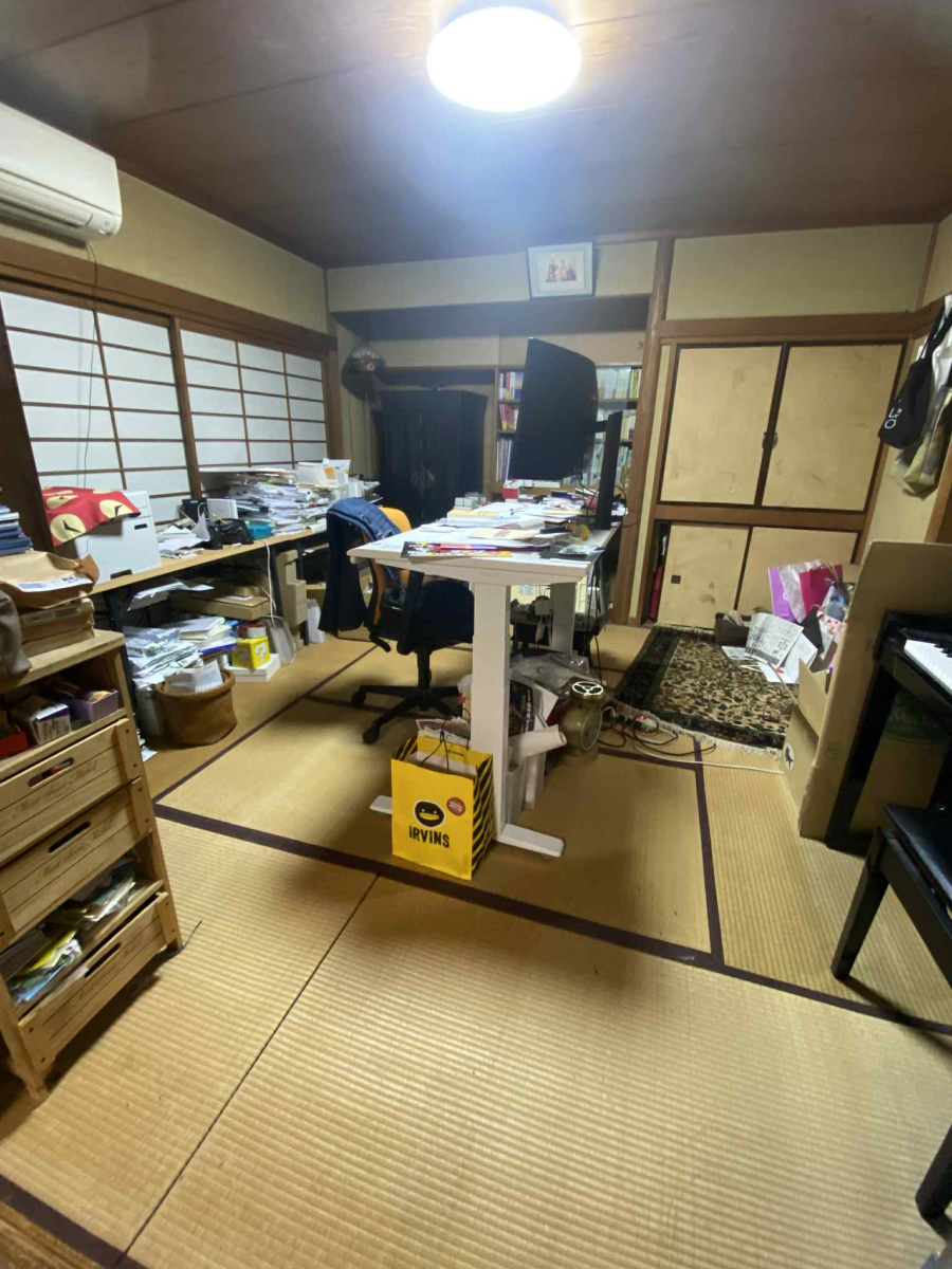 畳敷きの空間にデスクや書類が積み上がった部屋。